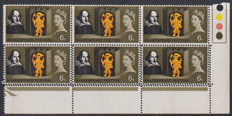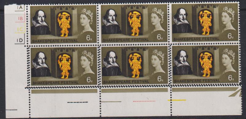 1964 6d Shakespeare Festival part traffic light block of 6 - stunning error: double perfs affecting bottom row - some perf