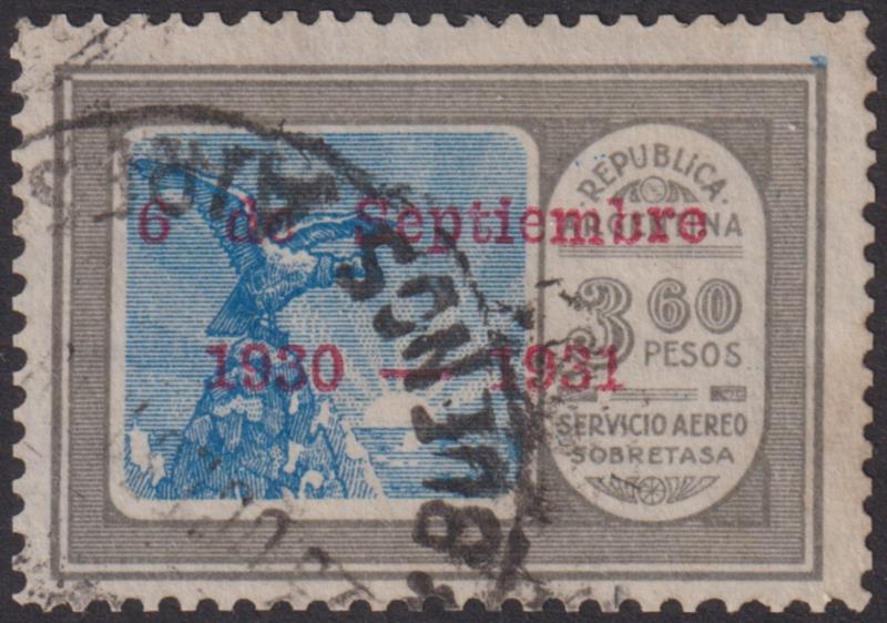 254 U imageBirds: Argentina 1931 30P60c "6 de Decembre 1930-1931" ovpt on 1928 Air (condor on mountain top) blue & grey. SG 628. Cat £60. FU. (Image)