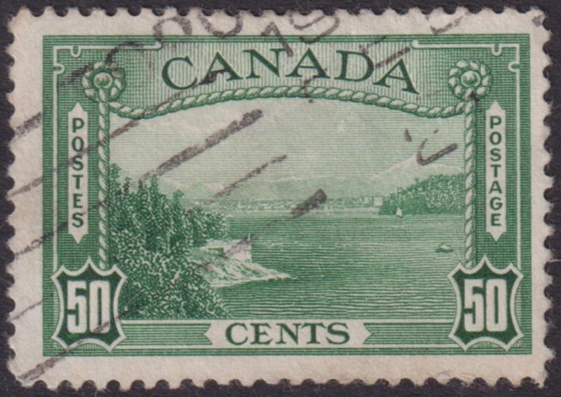 Canada 1938 50c Vancouver Harbour green. SG 366. Cat £16. FU. (Image)