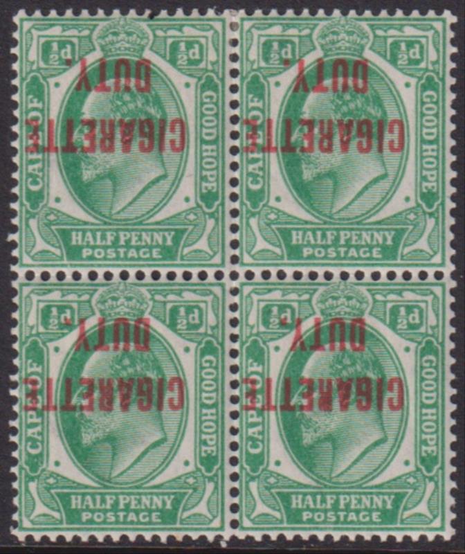 Cape of Good Hope 1909 ½d EVII block of 4 with invtd CIGARETTE DUTY ovpt. Barefoot 3a. Cat £40. 2 mint/2 MUH. (Image)