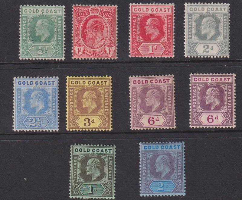 2703 M imageGold Coast 1907-8 ½d - 2/- EVII, mult crown CA wmk, 10v, & both 6d shades. SG 59 etc. Cat £183+. Mint. (Image)