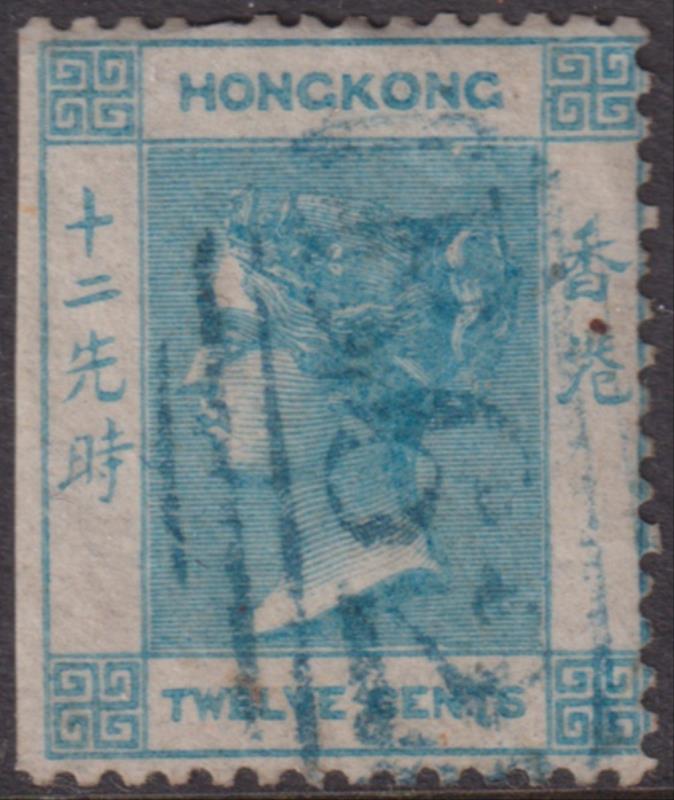 2713 U imageHong Kong 1862 12c QV pale greenish blue, no wmk, wing margin trimmed off. SG 3. Cat £65. FU. (Image)