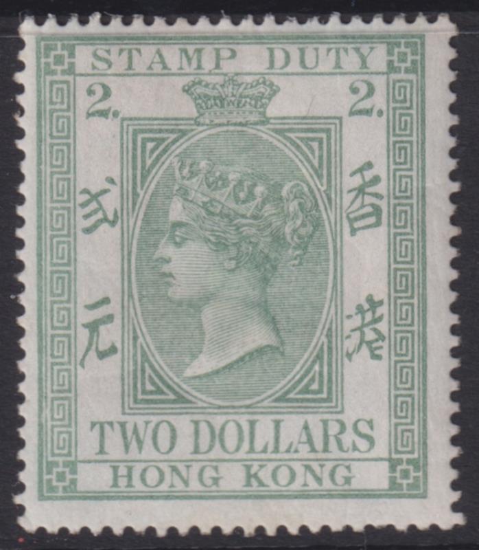 2718 * imageHong Kong 1874-1902 $2 Postal Fiscal dull bluish-green, p14, very very slight perf discolouration at base. SG F4. Cat £475 as mint. MUH. (Image)