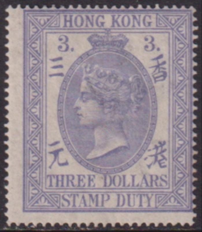 2719 M imageHong Kong 1874-1902 $3 Postal Fiscal dull violet, p15½ x 15, slightly aged gum. SG F2. Cat £425. Mint. (Image)