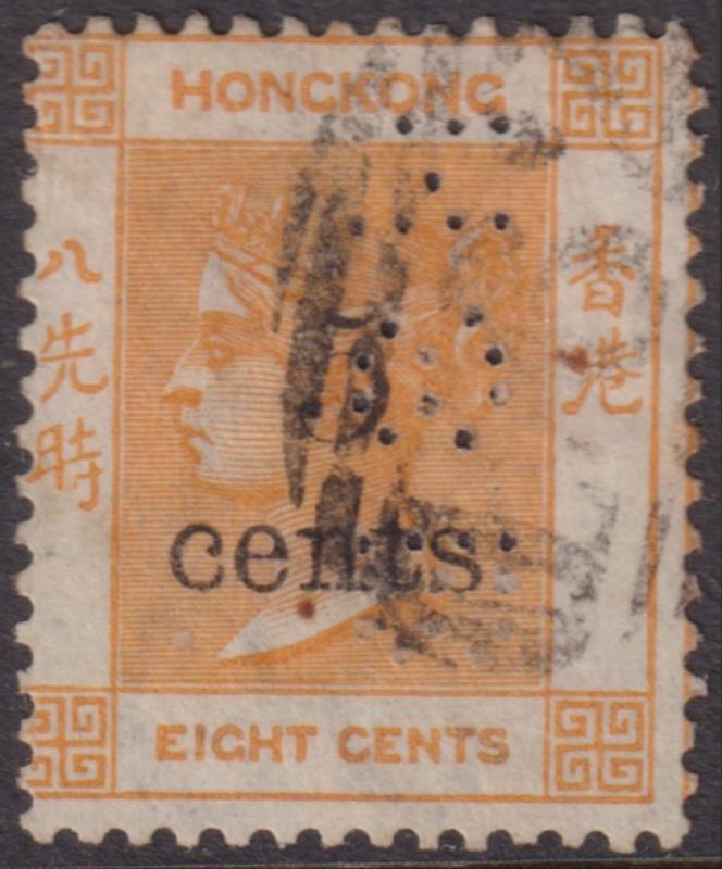2720 U imageHong Kong 1880 5c on 8c QV bright orange, crown CC wmk, "HSB" perfin, B62 cancel. SG 23. Cat £120. (Image)