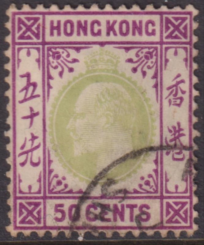 Hong Kong 1906 50c EVII green & magenta, chalky paper, multiple crown CA wmk, green faded. SG 85a. Cat £23. FU. (Image)