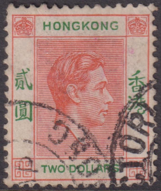 Hong Kong 1938 $2 GVI red-orange & green. SG 157. Cat £45. GU/FU. (Image)