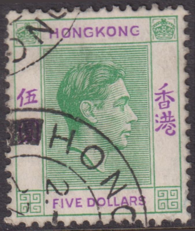 Hong Kong 1946 $5 GVI green & violet. SG 160. Cat £25. FU. (Image)