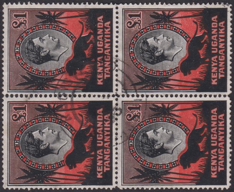 2821 U imageKUT 1944 £1 GVI Palms & Lion black & red block of 4, p14, ordinary paper, with central cds. Top value. Striking design. SG 150ab. Cat £140. FU. (Image)
