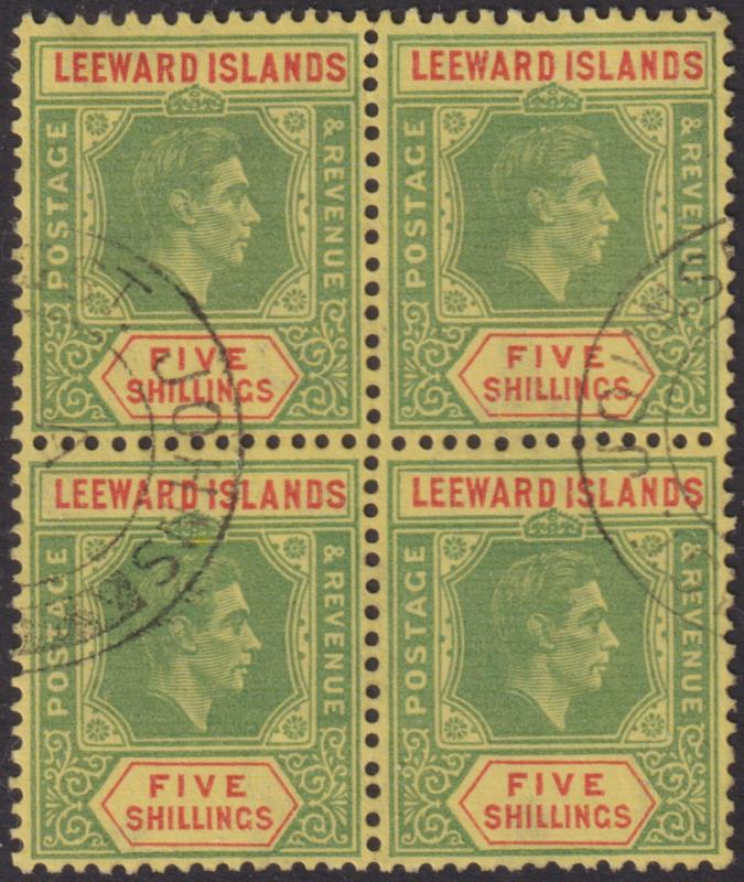 2829 U imageLeeward Isl 1943 5/- GVI green & red on yellow block of 4, ordinary paper. St Johns cds cancel. SG 112b. Cat £88. VFU. (Image)