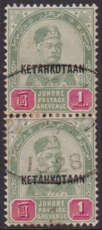 2836 U imageMalaya-Johore 1896 $1 Coronation vert pair, "KETAKOTAAN" ovpt error on both. SG 38a. Cat £380. FU. (Image)