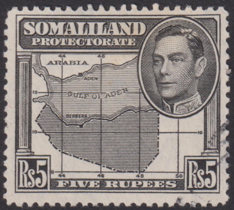 2915 U imageSomaliland Protectorate 1938 5R GVI & Map black. "FU" but corner pmk appears dubious. SG 104, cat £40 mint, £75 used. (Image)