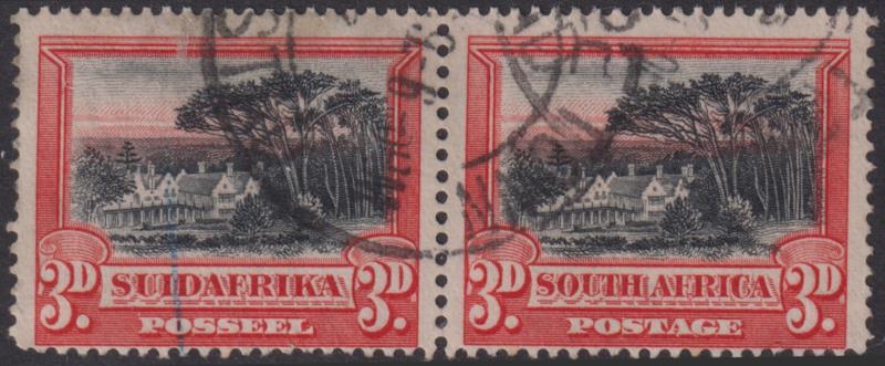 2917 U imageSouth Africa 1927 3d Groot Schuur (mansion) black & red horiz bilingual setenant pair, p14. Two short perfs. SG 35. Cat £38. FU. (Image)