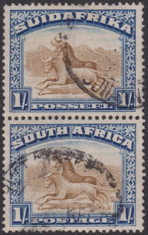 2918 U imageSouth Africa 1927 1/- Wildebeest deep green & brown vert bilingual setenant pair, p14. SG 36. Cat £65. GU/FU. (Image)