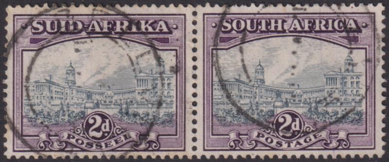2922 U imageSouth Africa 1941 2d Union Buildings grey & dull purple horiz bilingual setenant pair, p14. "SUID-AFRIKA" with hyphen. SG 58a. Cat £120. FU. (Image)