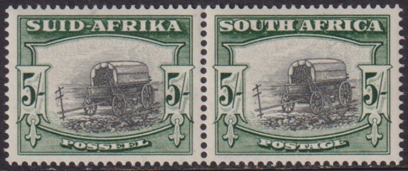 2923 * imageSouth Africa 1954 5/- black & deep yellow-green bilingual pair (type II). SG 122b. Cat £50. MUH. (Image)