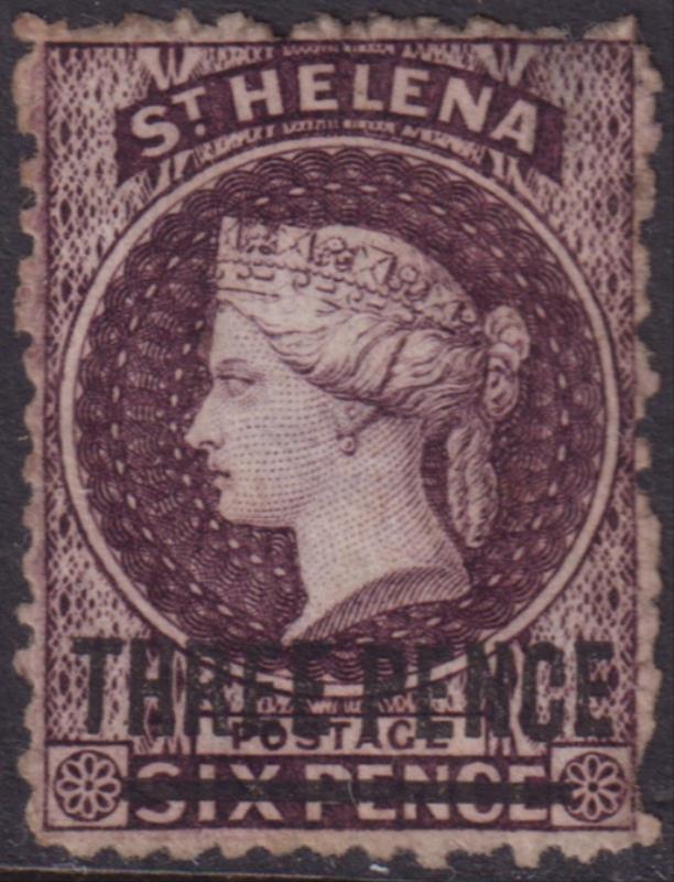 2935 U imageSt Helena 1868 3d on 6d QV deep dull purple, p12½, ovpt Type B, crown CC wmk. SG 11. Cat £50. FU. (Image)