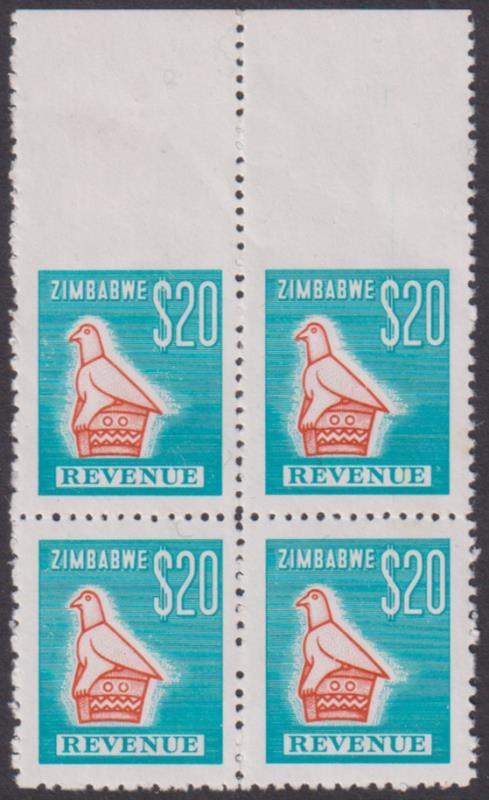 2965 R imageZimbabwe 1981 $20 turquoise & orange revenue error, upper selvedge block of 4 - upper stamps imperf at top. Barefoot 15. MUH. (Image)