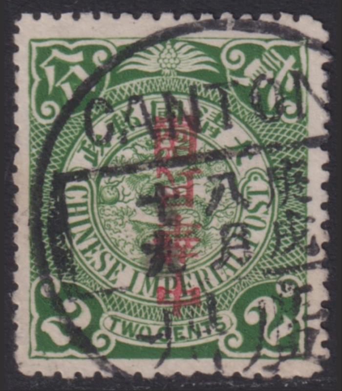 2977 U imageChina 1912 (March) 2c green with ovpt in red, variety "ovpt inverted", possibly an unofficial ovpt but clearly canc by "Canton" circular d/s in black. Rare. SG 217a. Cat £3750. (Image)