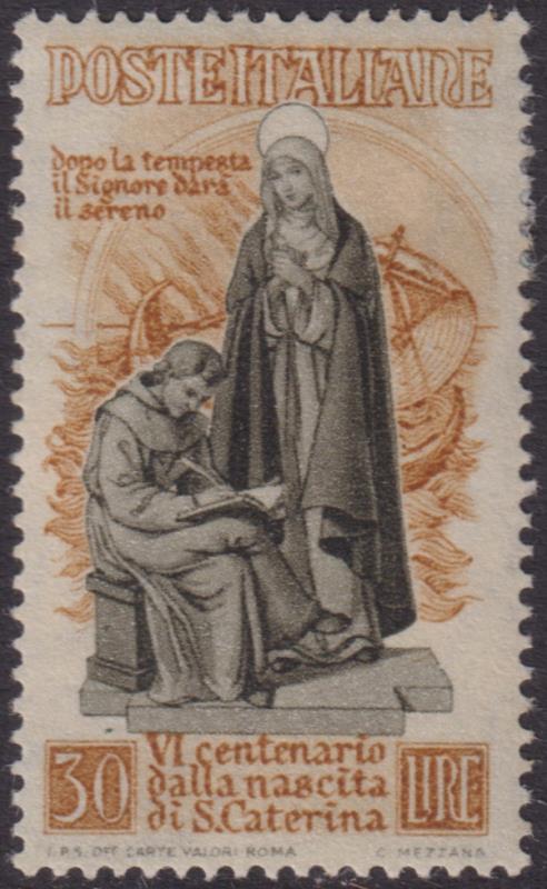Italy 1948 30L 600th Birth Anniv St Catherine olive grey & bistre. SG 701. Cat £29. Mint. (Image)