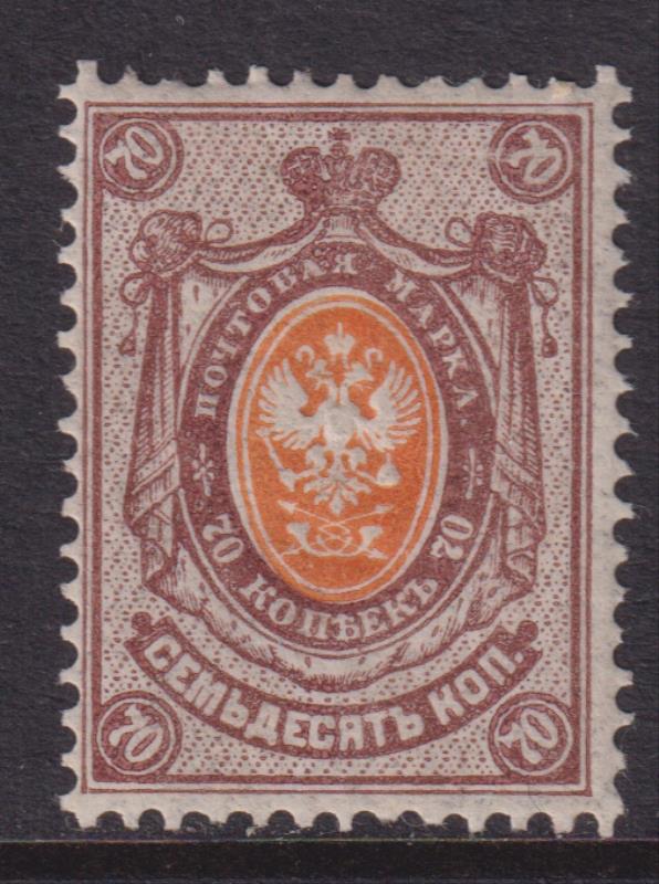 3241 M Russia 1909 70k orange & cinnamon, wove paper, varnish lines on face. SG 105. Cat £25. Mint.