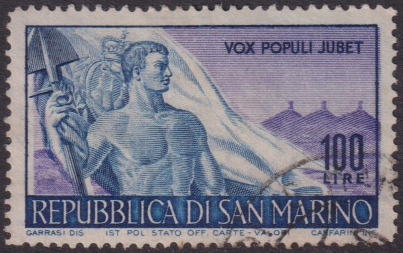 3256 U imageSan Marino 1948 100L Worker & Flag deep blue & violet. SG 371. Cat £65. FU. (Image)