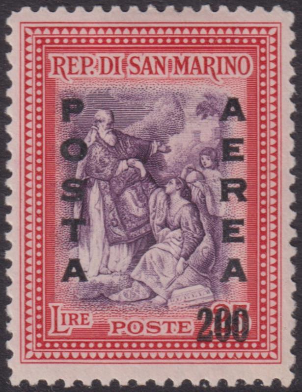 3257 M imageSan Marino 1948 200L ovptd "AEREA 200" (vertically) mauve & red. SG 373. Cat £80. Mint. (Image)