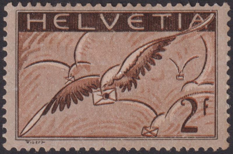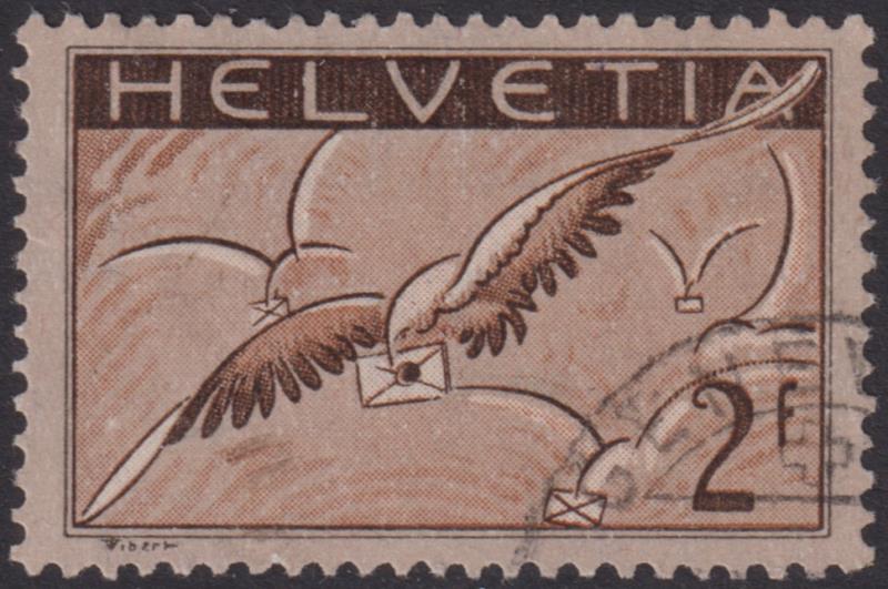 Switzerland 1930 2F Airmail chestnut, sepia & grey-brown (eagle carrying letter). Original issue. Faint crease visible on