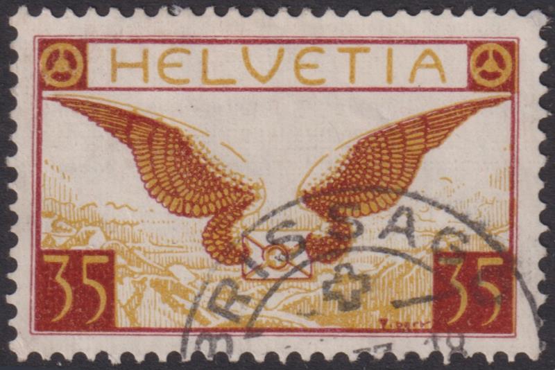 Switzerland 1933 35c Airmail lake-brown & brown-ochre (winged envelope). Chalk-surfaced paper, grilled gum. Faint crease.