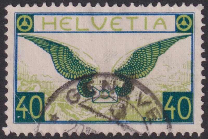 Switzerland 1933 40c Airmail blue & apple-green (winged envelope). Chalk-surfaced paper, grilled gum. Weak corner perf. SG
