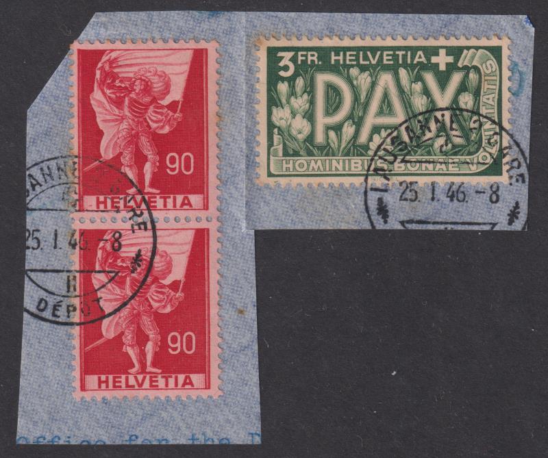 3302 U imageSwitzerland 1945 3F Peace on piece, & 90c x 2 Historical Figures. SG 409, 457. Cat £130+. VFU. (Image)
