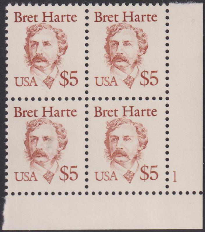 3322 * imageUSA 1987 $5 Great Americans (Bret Harte) copper red in lower RH corner block of 4 with plate No. Scott 2196. Cat US$36. MUH. (Image)