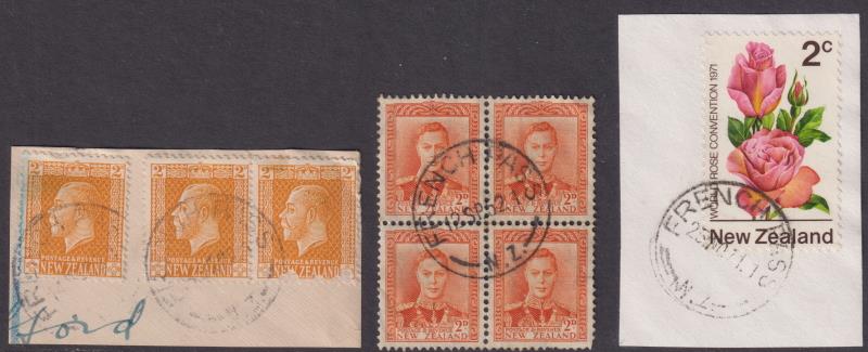 Colac Bay (IN 1882-1974) part strikes of 4 diff cds 1890s-1940s incl A-type on 2d SSF, H AP 06 on 1d Universal, 25mm J NO 26 on 1d Dominion, & 29mm J SP 41 on 2d Cent. Also good complete J 29 DE 71 on piece (5 items).