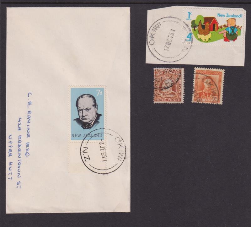 Okiwi (AK 1900-89, Great Barrier Island) fine 29mm J-type cds 8 JE 65 on fine cover & 2 fine strikes (?) MR 48 (partial), 17 OC