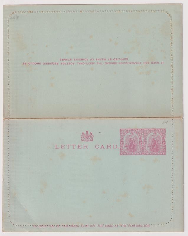 492 C 1895 1½d QV lettercard, violet on light green, type I panels, rotary p10. Unfolded. Minor faults on perforated border, otherwise fine unused. Samuel BA4a. Cat $40 (2001).