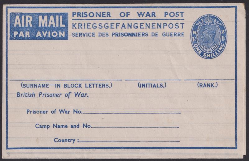 506 C image1944 1/- GVI blue POW aerogramme, incl single line blue border on front "SEE NOTE ON FLAP" deleted. Samuel GA5a. Cat $350. Unused. (Image)