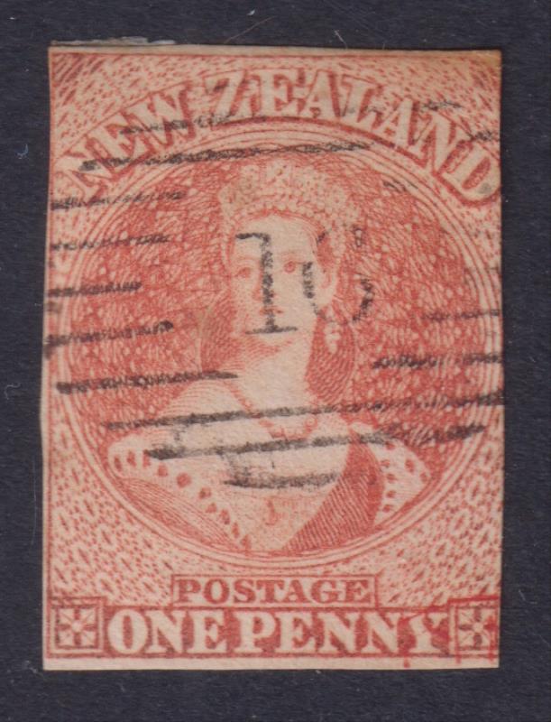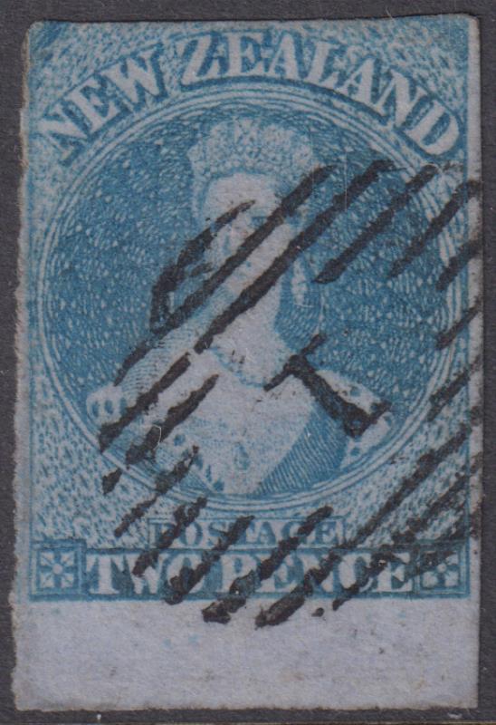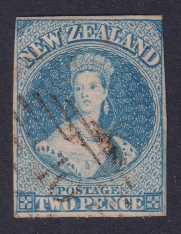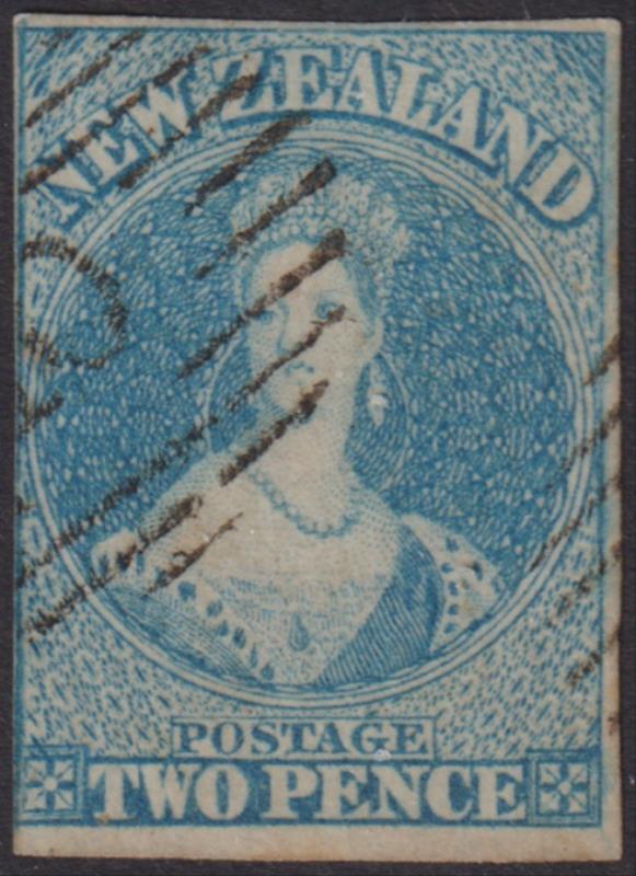 519 U imageFFQ Chalon Chalon 2d blue, imperf 4 margins, no wmk, light barred 10 cancel (Wellington). SG 10. Cat £180. FU. (Image)
