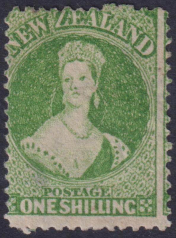 FFQ Chalon 1/- green, p12½, star wmk, 1 short corner perf. SG 124. Cat £180. FU. (Image)