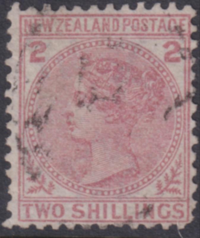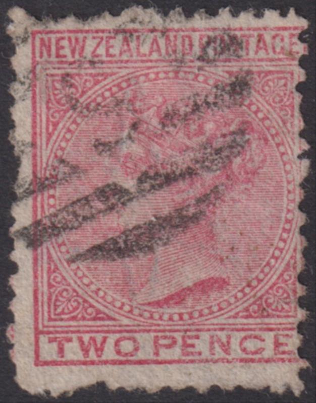 1875 2d FSF deep rose, large star wmk, p12½. Near complete "S" barred obliterator cancel (Invercargill). CP C2c. Cat $100.