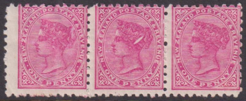 1890, 1897 1d SSF rose flaw "screwdriver" (R9/2) p10 in strip of 3. CP D2j(T). Cat c$170. MUH. (Image)