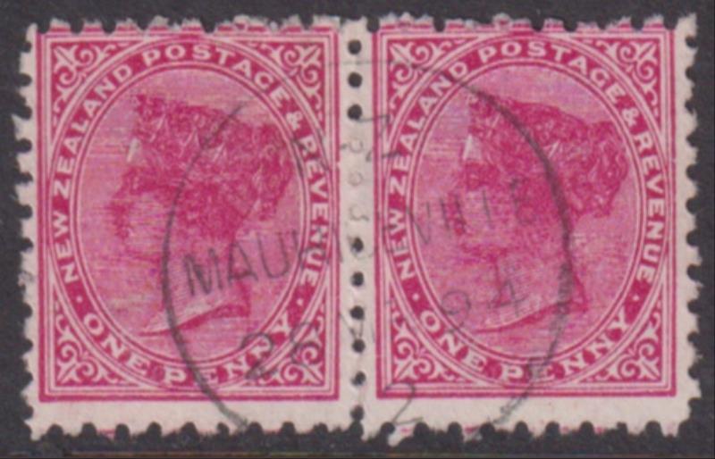 1893 1d SSF horiz pair, p10, advts Flag & Lace, 2nd setting in mauve (positions 178? & 179), TE AROHA 4 NO 93 "A" class cds.