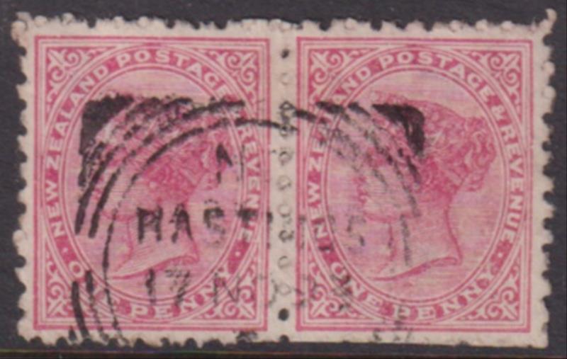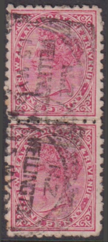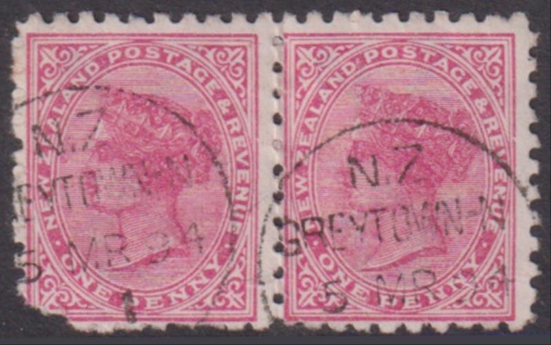 1893 1d SSF horiz pair, p10, advts Use Kaitangata & S Myers, 2nd setting in red-brown (positions 188 & 189 - latter with