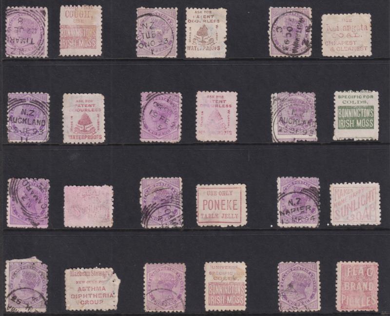 1893 2d SSF lilac, p10, 2nd or 3rd setting advts, commoner colours, x 40 diff, all damaged (tears, thins, creases etc). CP DA3g (4,7,8). Cat $480.