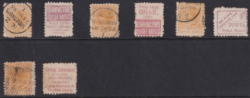 1893 3d SSF p10 advts x 4: Bonnington's Irish Moss (Stop that Cough & Will Cure ...), Poneke Potted Meats, & Lattey, Livermore.