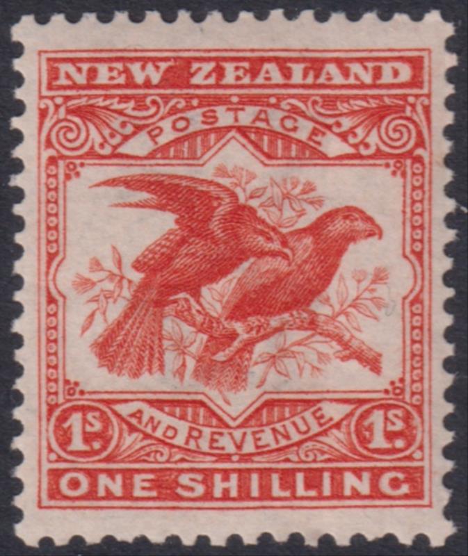 1907 1/- Kaka orange-red reduced, p14 x 15, very light vert bend. CP E19b. Cat $1000. MUH. (Image)