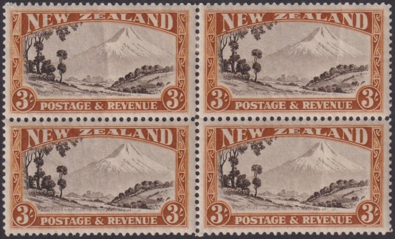 1935 3/- Mt Egmont block of 4, p13½ x 14, experimental "wet printing". Couple of light bends & crease visible on reverse. CP