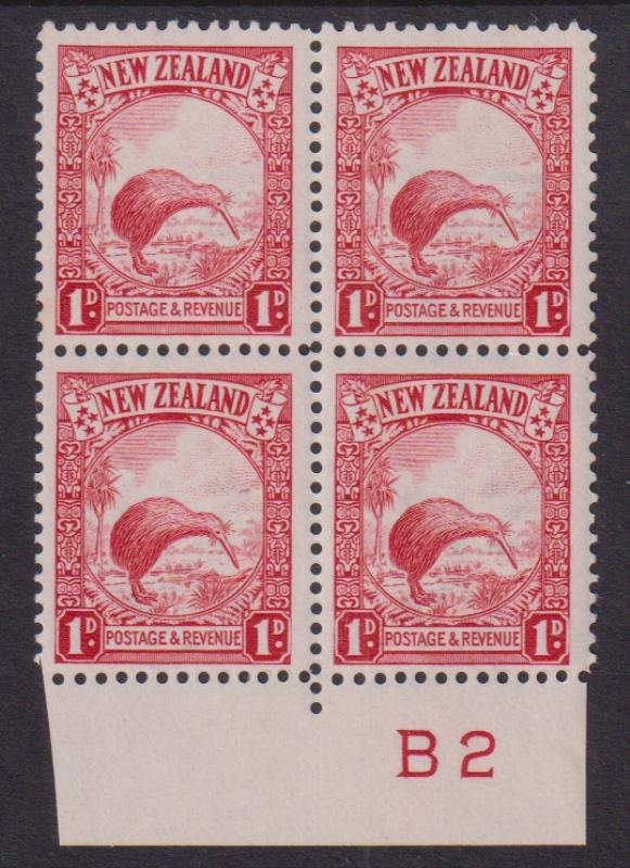 1936 1d Kiwi p13½ x 14 plate block of 4. B2 "imperf left" (selvedge). CP L2b. Cat $2000. Mint (3 stamps MUH). (Image)