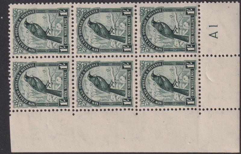 1942 1/- Tui plate A1 block of 6 (2 x 3), p14 x 13½, multiple wmk, coarse paper hinged in margin only. CP L12d. Cat $145.