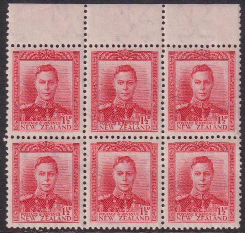 1944 1½d GVI red upper selvedge horiz block of 6, with partial invtd offsets on 2nd row. Mint/MUH. (Image)