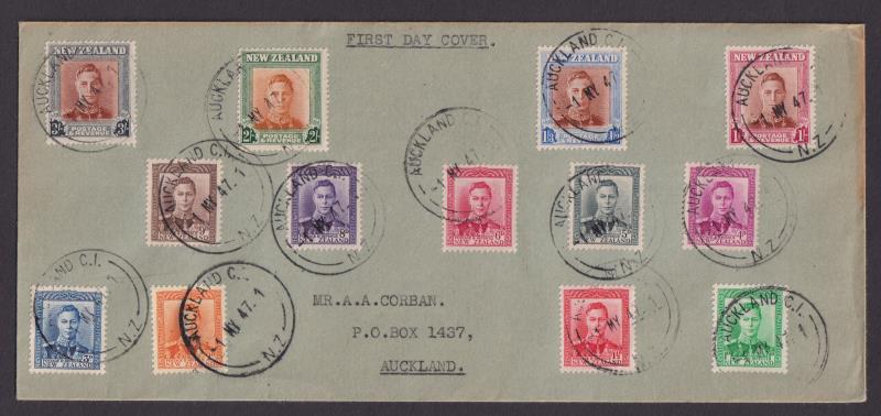 1947 ½d-3/- GVI set of 14 on plain FDC (long) typed address, set incl ½d, 1d, 1½d, 3d issued earlier, canc Auckland cds 1 MY